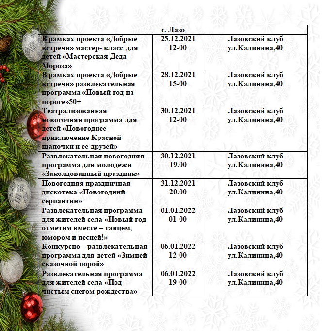 До Нового года осталось совсем немного времени.Для Дальнереченцев больших и маленьких подготовленная насыщенная программа новогодних мероприятий. Хорошее настроение горожанам начнут дарить уже с 24 декабря. Сёла Лазо и Грушевое, ЛДК, Детская школа искусств, Музей и библиотечная система – везде можно поучаствовать в праздничных мероприятиях.