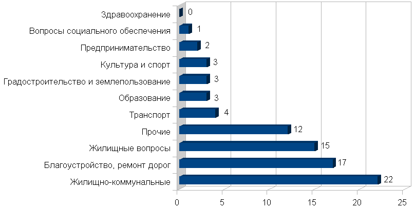 Анализ тематики обращений граждан к главе округа, заместителю председателя Думы показывает, что наибольшее количество обратившихся интересовал вопрос о предоставлении и ремонте жилья 62 (34.3%). 49 (27 %) граждан пришедших на прием, обратились по вопросам жилищно-коммунального хозяйства и благоустройства. По этому разделу граждане в основном жалуются на ненадлежащее качество предоставляемых услуг ресурсоснабжающими и обслуживающими организациями, а также на неправомерное, по их мнению, выставление счетов за оказанные услуги.