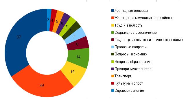 Из всех поступивших письменных и электронных обращений в 2012 году 15 или 18 % составляют обращения по жилищным вопросам. Граждане обращаются с заявлениями на предоставление жилья, на переселение из ветхого и аварийного жилья, с просьбами оказать содействие в получении жилищного сертификата, произвести ремонт жилья. По-прежнему актуальна тема жилищно-коммунального хозяйства – 22 вопроса, что составляет 27 % от общего числа обращений. В 2011 году доля этих обращений составляла 31,1 % или в 2012 году уменьшилась на 4,1 %.