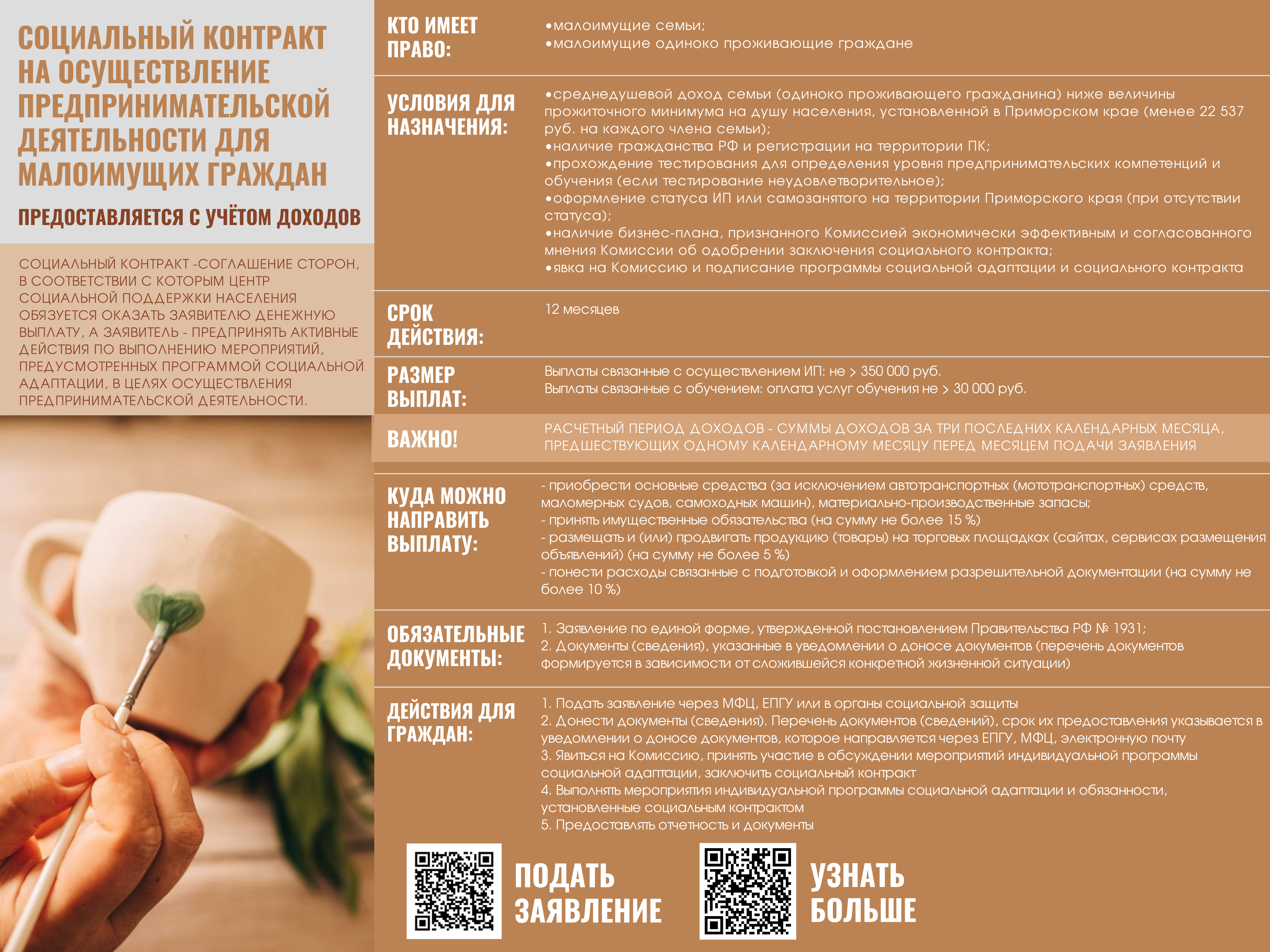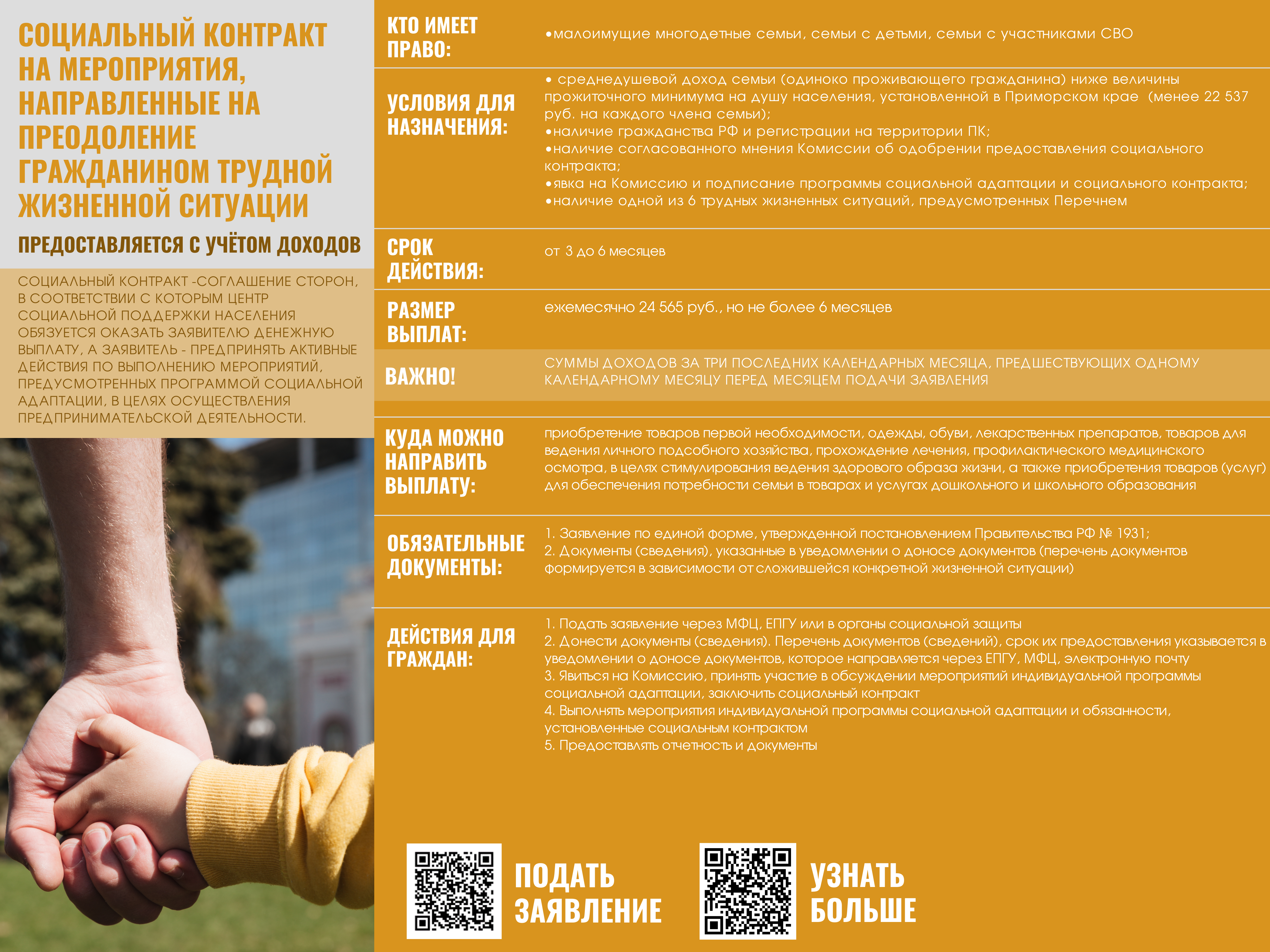 Если Ваш среднедушевой доход и/или доход Вашей семьи по не зависящим от Вас причинам ниже величины прожиточного минимума на душу населения, установленной в Приморском крае (менее 22537 руб. на каждого члена семьи), предлагаем рассмотреть возможность получения государственной социальной помощи на основании социального контракта.