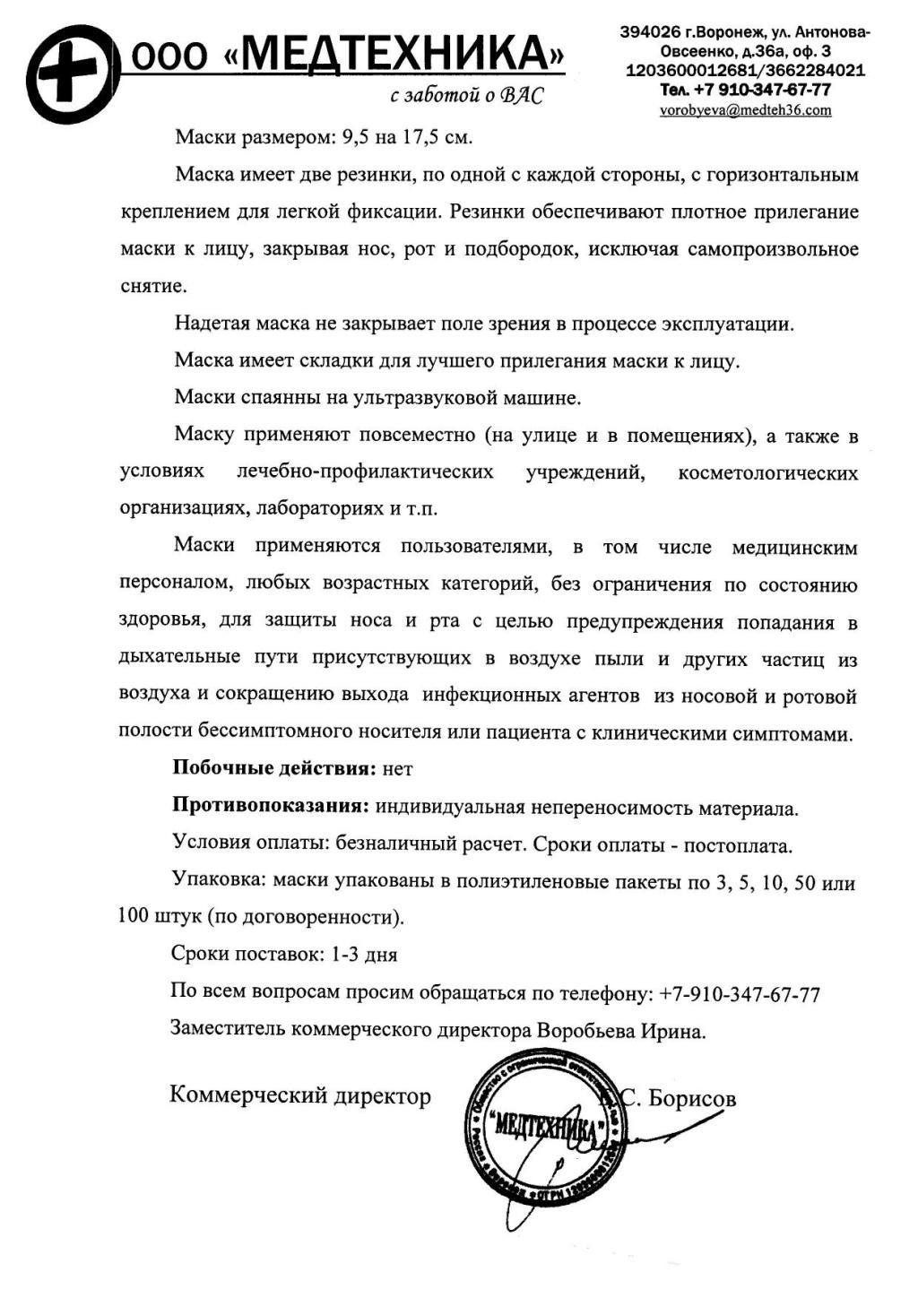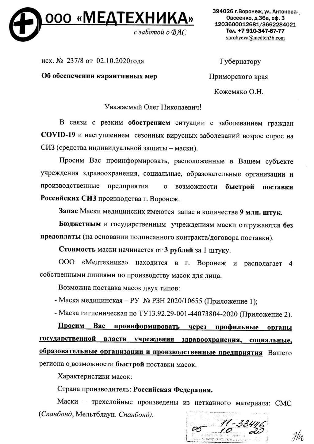 Министерство промышленности и торговли Приморского края, направляет для сведения информацию ООО «Медтехника» о возможности быстрой поставки средств индивидуальной защиты – масок.